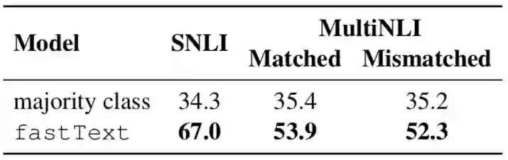 为了确定这种人为行为对数据的影响程度,我们训练一个模型来预测生成句子的标签,无需查看前提句子。具体来说,我们使用现成的文本分类器fastText,它可以将文本模型化为许多单词和二元语法(bigrams),以预测句子的标签。