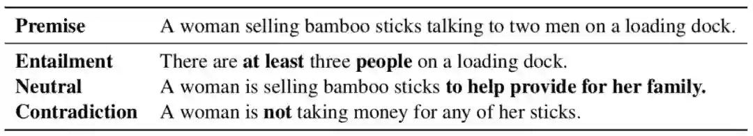 2015年,Bowman等人通过众包标记的方法创造了大规模推断数据集SNLI;2018年,Williams等人又推出了MultiNLI数据集。在这一过程中,研究人员从一些语料中抽取某个前提句子p,让众包标注者基于p创作三个新句子,创作的句子与p有三种关系标准:
