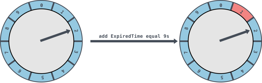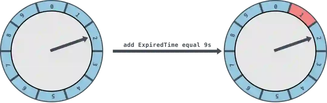 如果当前的指针 currentTime 指向的是 2,此时如果插入一个 9s 的任务进来,那么新来的任务会服用原来的时间格链表,会存放到时间格 1 中