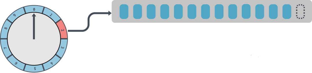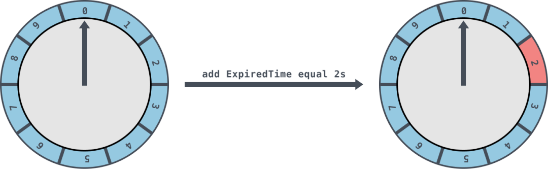 初始情况下表盘指针 currentTime 指向时间格0,若时间轮的 tickMs 为 1ms 且 wheelSize 等于10,那么 interval 则等于 10s。如下图此时有一个定时为2s的任务插进来会存放到时间格为 2 的任务链表中,用红色标记。随着时间的不断推移,指针 currentTime 不断向前推进,如果过了 2s,那么 currentTime 会指向时间格 2 的位置,会将此时间格的任务链表获取出来处理。