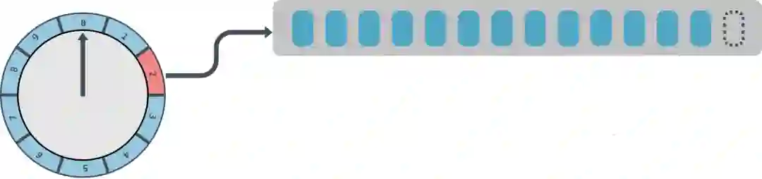 如下图是一个 tickMs 为 1s,wheelSize 等于 10 的时间轮,每一格里面放的是一个定时任务链表,链表里面存有真正的任务项: