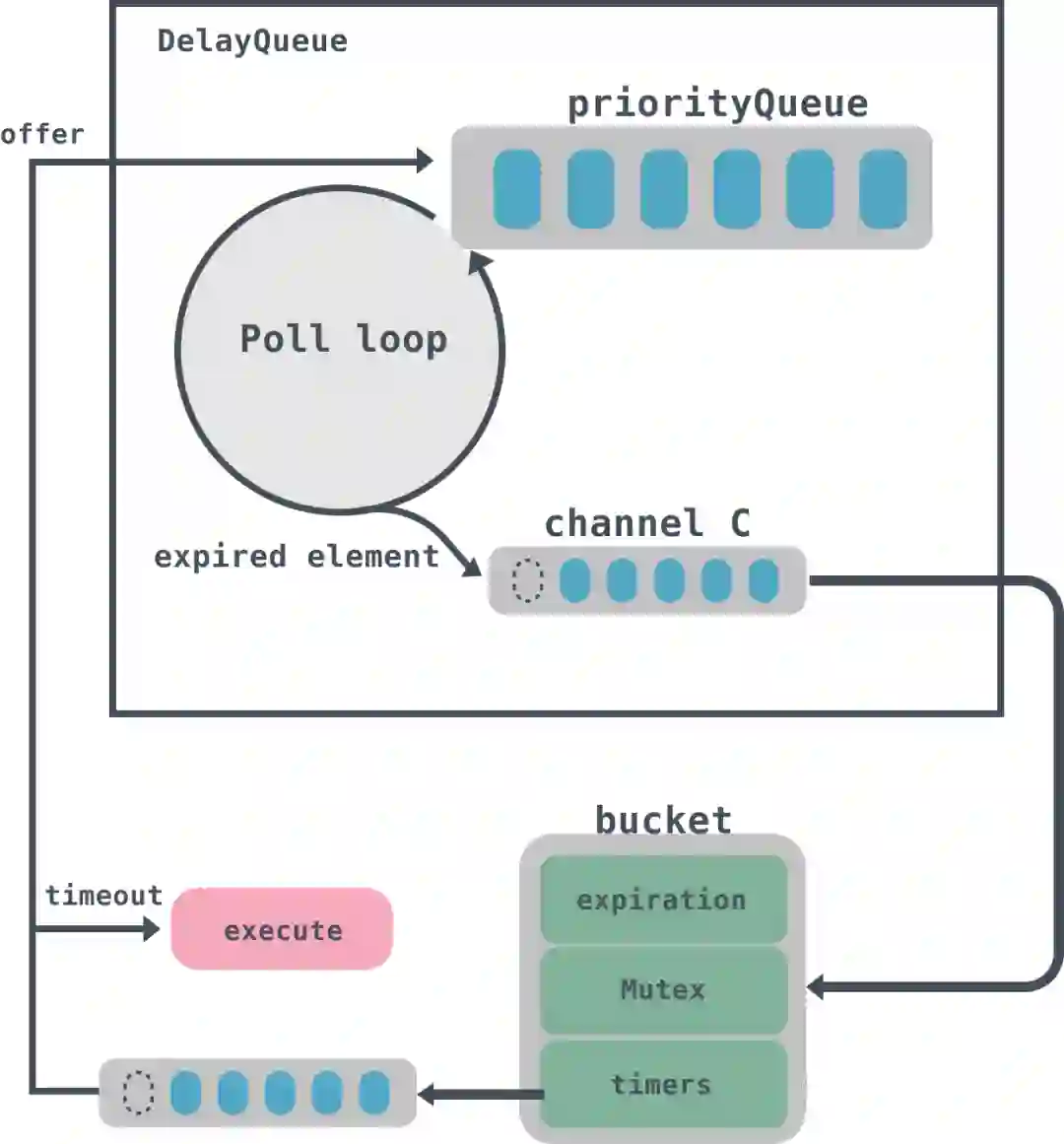 start 方法启动第二个 goroutines 方法会循环获取 DelayQueue 中管道C的数据,管道 C 中实际上存放的是一个 bucket,然后遍历bucket的timers列表,如果任务已经到期,那么异步执行,没有到期则重新放入到 DelayQueue 中。