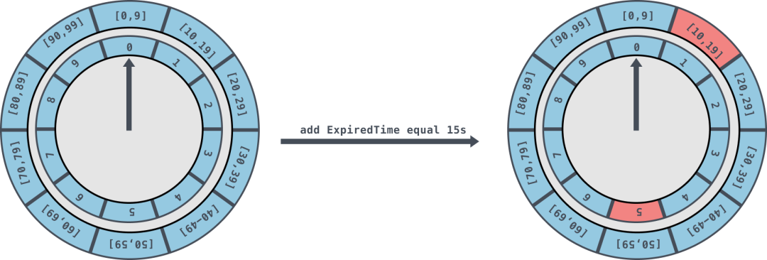 如果向该时间轮中添加一个 15s 的任务,那么当第一层时间轮容纳不下时,进入第二层时间轮,并插入到过期时间为[10,19]的时间格中。
