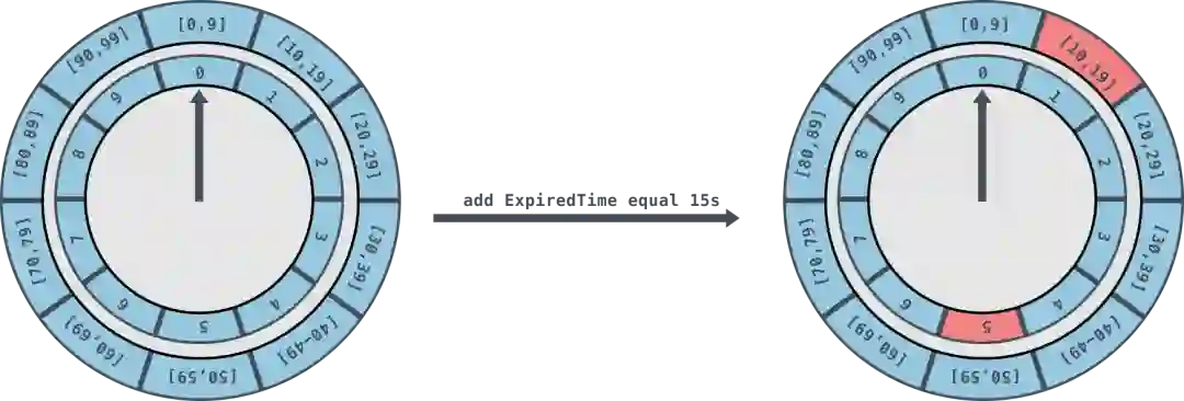 图中展示了每个时间格对应的过期时间范围, 我们可以清晰地看到, 第二层时间轮的第 0 个时间格的过期时间范围是 [0,9]。也就是说, 第二层时间轮的一个时间格就可以表示第一层时间轮的所有(10 个)时间格;
