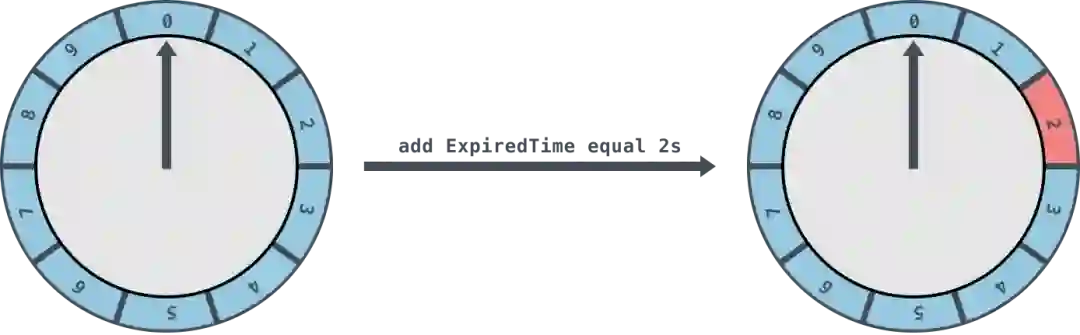 例如现在初始化一个tick是1s,wheelSize是10的时间轮: