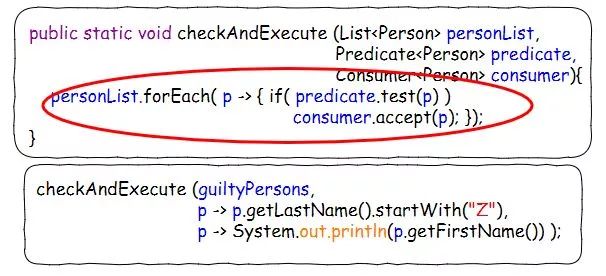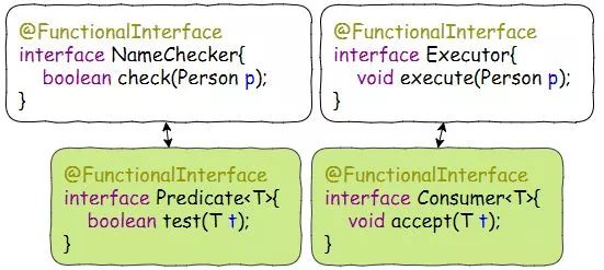 当然可以。在Java 8中有一个函数式接口的包,里面定义了大量可能用到的函数式接口(java.util.function (Java Platform SE 8 ))。所以,我们在这里压根都不需要定义NameChecker和Executor这两个函数式接口,直接用Java 8函数式接口包里的Predicate<T>和Consumer<T>就可以了——因为他们这一对的接口定义和NameChecker/Executor其实是一样的。
