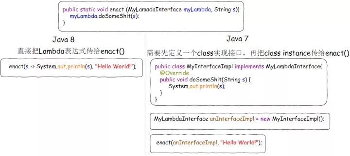 有些情况下,这个接口实现只需要用到一次。传统的Java 7必须要求你定义一个“污染环境”的接口实现MyInterfaceImpl,而相较之下Java 8的Lambda, 就显得干净很多。
