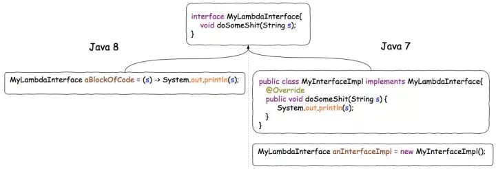 这两种写法本质上是等价的。但是显然,Java 8中的写法更加优雅简洁。并且,由于Lambda可以直接赋值给一个变量,我们就可以直接把Lambda作为参数传给函数, 而传统的Java必须有明确的接口实现的定义,初始化才行: