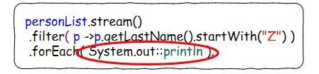 对比最开始的Lambda写法,这里已经非常非常简洁了。但是如果,我们要求变一下,变成print这个人的全部信息,及p -> System.out.println(p); 那么还可以利用Method reference来继续简化。所谓Method reference, 就是用已经写好的别的Object/Class的method来代替Lambda expression。格式如下: