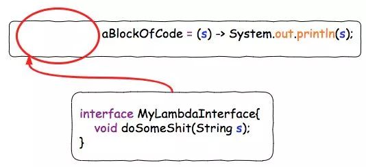 在Java 8里面,所有的Lambda的类型都是一个接口,而Lambda表达式本身,也就是”那段代码“,需要是这个接口的实现。这是我认为理解Lambda的一个关键所在,简而言之就是,Lambda表达式本身就是一个接口的实现。直接这样说可能还是有点让人困扰,我们继续看看例子。我们给上面的aBlockOfCode加上一个类型: