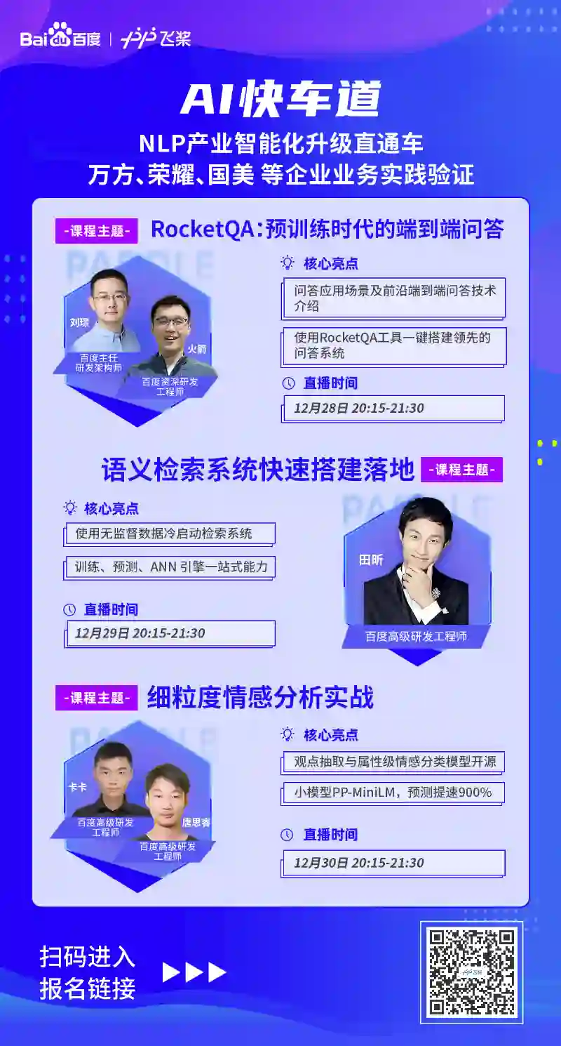 12.28~12.30日每晚20:15~21:30,百度高工将带来直播讲解,剖析行业痛点问题,深入解读系统方案,并带来手把手项目实战。欢迎大家扫码上车!直播间不见不散~