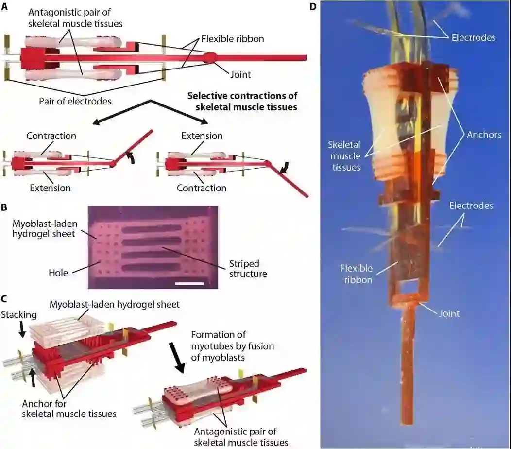 试验中所使用的组织不是来自于生物体提取,而是来自实验室的培育。换句话说,是从零开始培育肌肉、而不是摘取在动物体内长出的肌肉。研究人员通过含实验鼠骨骼肌细胞的溶液制作出长方形的肌肉薄片,在十天时间里,肌肉会在骨骼上慢慢生长,再叠加薄片培育出长约8毫米的肌肉组织。再将肌肉组织安装在手指形的树脂骨骼两面,制成了这个全长近3厘米的手指机器人。这些肌肉纤维能在10毫牛的力量下收缩。