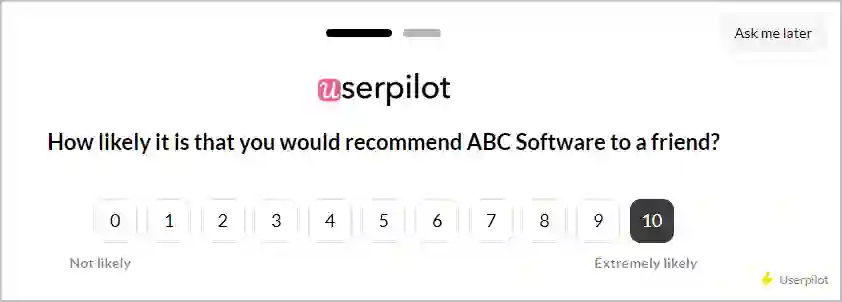 应用内NPS调查有助于了解用户情感和忠诚度。它询问客户将你的产品推荐给其他人的可能性。