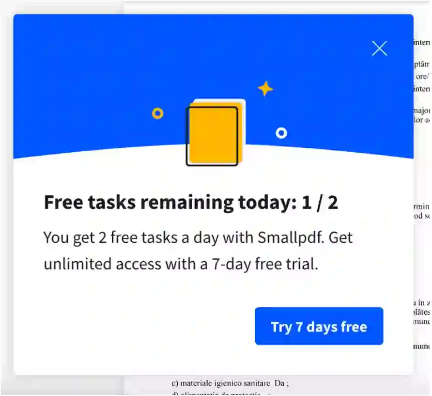 为了最大限度地增加付费试用的注册人数,小型PDF使用了简洁的缩印、迷人的图形和一个大的CTA(行动指引)按钮。这个模式清楚地告诉客户,除非他们升级,否则他们对任务的访问将在再运行一次后被切断。