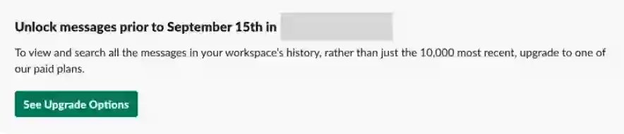 例如,当Slack用户向上滚动查找旧消息时,会弹出一条横幅,说他们已经收到了前10,000条消息;因此,如果用户需要查看旧信息,他们将不得不升级到付费计划。