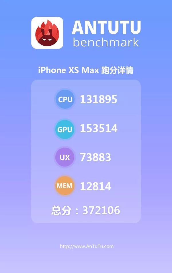 我们也试图用安兔兔给 iPhone XS Max 跑下分,不过中途出现了闪退的情况,应该是兼容性问题,有待后续的软件更新。不过,安兔兔官方倒是公布了 iPhone XS Max 的跑分成绩,总分达到了 37 万,力压骁龙 845。