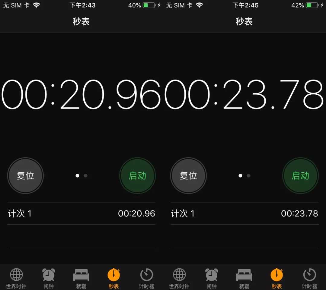 iPhone XS Max 耗时 21 秒,iPhone 8 Plus 不到 24 秒,差距非常微弱。