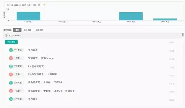 上图中展示了一位用户在某电商网站上的详细行为轨迹,从官网到落地页,再到商品详情页,最后又回到官网首页。网站购买转化率低,以往的业务数据无法告诉你具体的原因;通过分析上面的用户行为轨迹,可以发现一些产品和运营的问题(比如是不是商品不匹配等等),从而为决策提供依据。