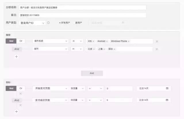 在数据分析中,我们往往针对特定行为、特定背景的用户进行有针对性的用户运营和产品优化,效果会更加明显。上图中,我们通过 GrowingIO 的用户分群功能将一次促销活动中支付失败的用户挑选出来,然后推送相应的优惠券。这样精准的营销推广,可以大幅度提高用户支付的意愿和销售金额。