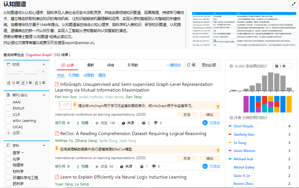 那么,想深入学习和研究认知图谱,研读该领域的经典论文,对于研究者和从业者都必不可缺。经过我们对人工智能领域国际顶会/期刊中“认知图谱”相关关键词论文的计算,以及热心读者徐菁博士的整理,AMiner 推出了 100 篇认知图谱经典必读论文。这些论文可以说基本都是经典中的经典,他们多是领域大佬+顶级会议的组合,读完它们,相信你对认知图谱的认认识肯定会有质的飞越。