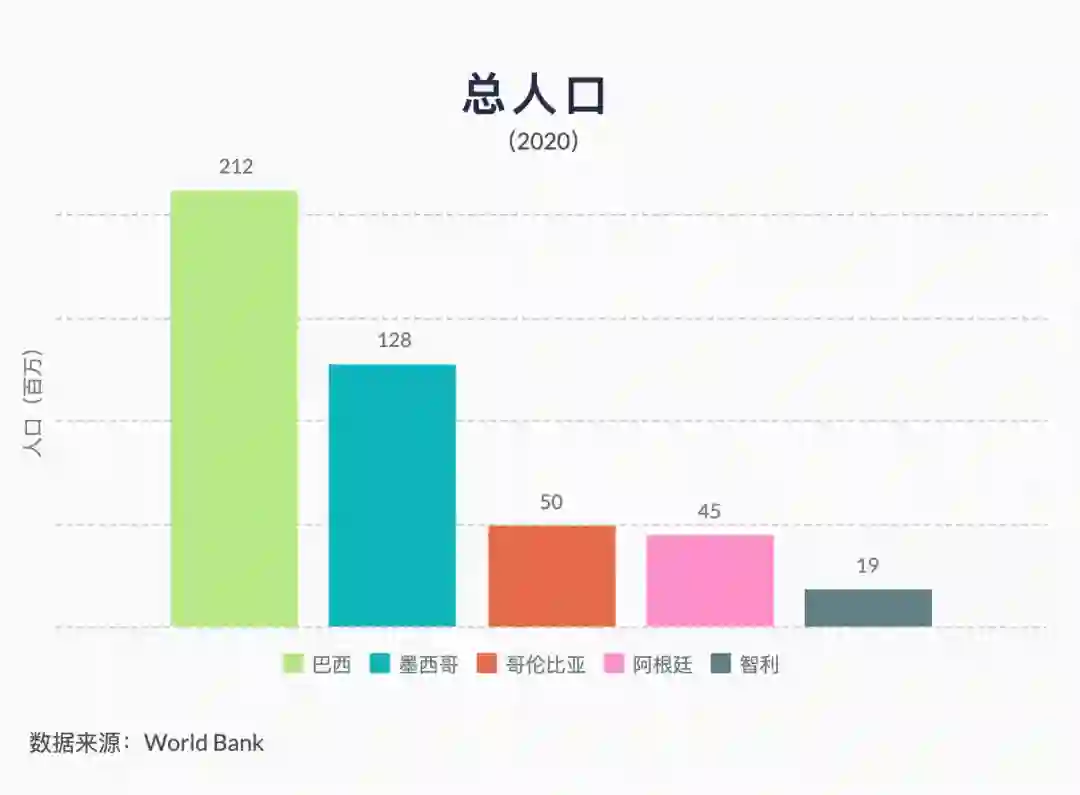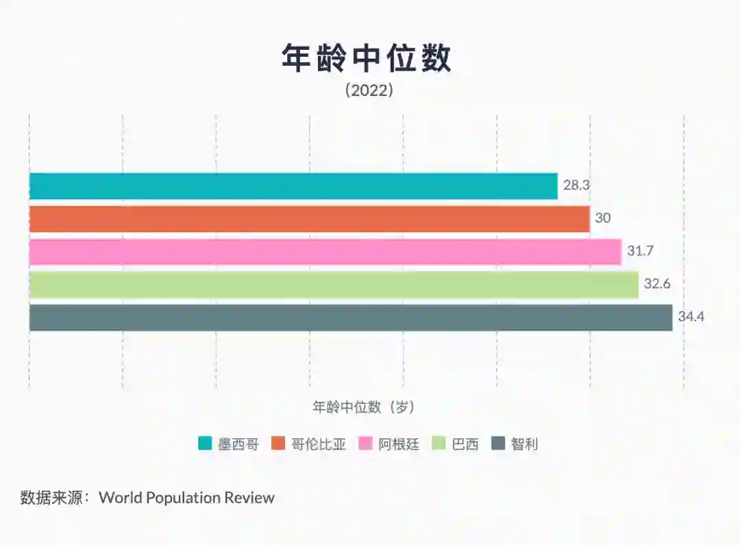 同时,拉美也是一片相对“年轻”的大陆。根据世界人口综述(World Population Review)2022年的数据,巴西的年龄中位数为32.6岁,是上述拉美主要市场中较“老”的国家。不过仍旧比欧洲四大经济体(年龄中位数平均40岁)和中国(37.4)要年轻不少。