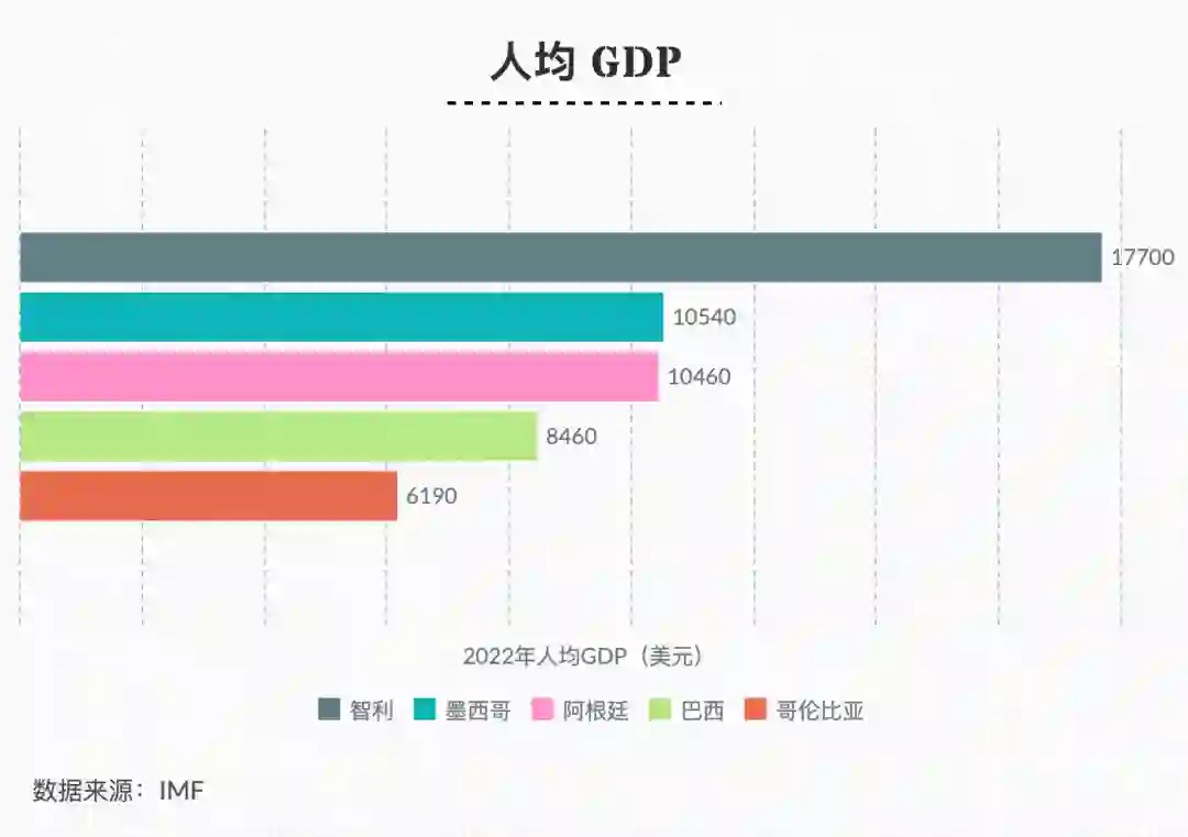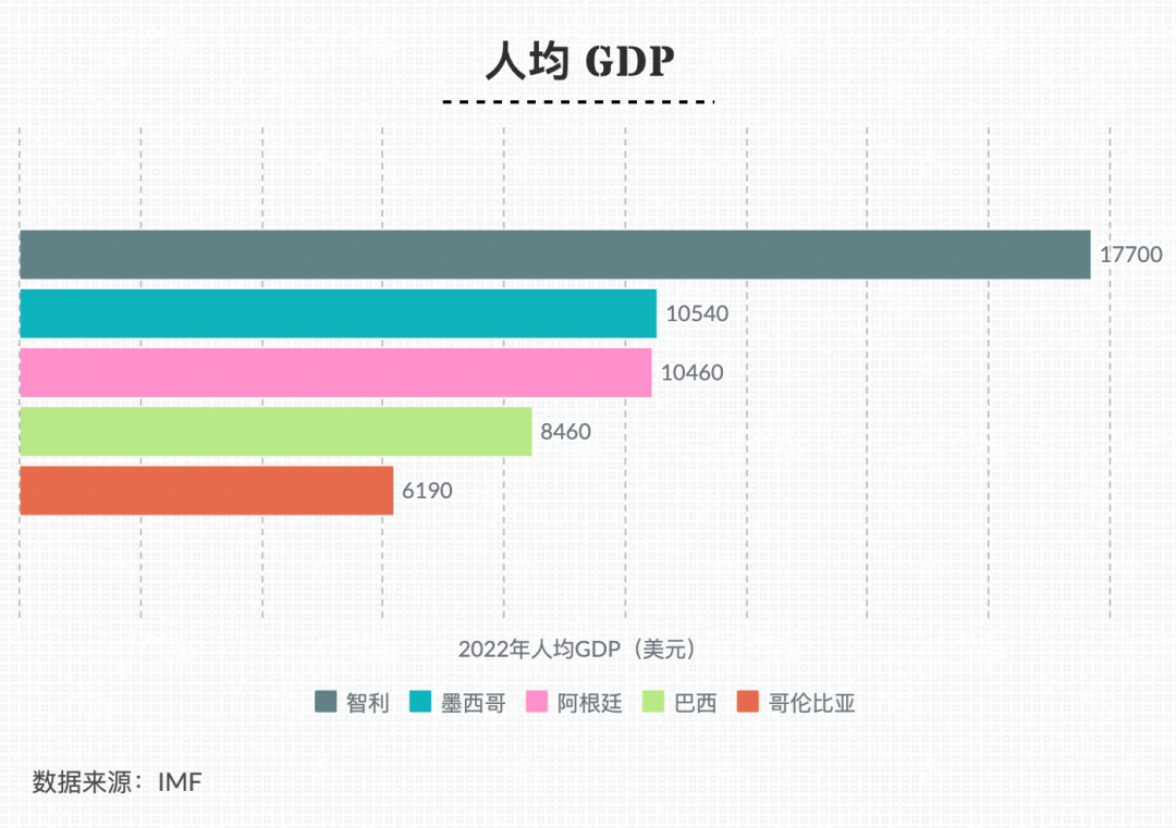 巴西人民生活水平方面,从人均 GDP 来看,根据 IMF 2022 年数据显示,该国人均 GDP 为8460美元。相较于智利、墨西哥、阿根廷和哥伦比亚,巴西的人均 GDP 倒数第二,仅高于哥伦比亚的6190美元。同时,巴西是一个贫富差距极大的国家,且该差距有进一步扩大的趋势。经济参考报2021年的报道称,根据世界银行制定的国际贫困最低标准(即每日生活费在1.9-5.5美元),受疫情影响,巴西贫困人口猛增至4550万人,占巴西总人口约21%,然而,巴西最富有的1%人口的年平均收入达到了54.1万美元,甚至赶超法国富豪。