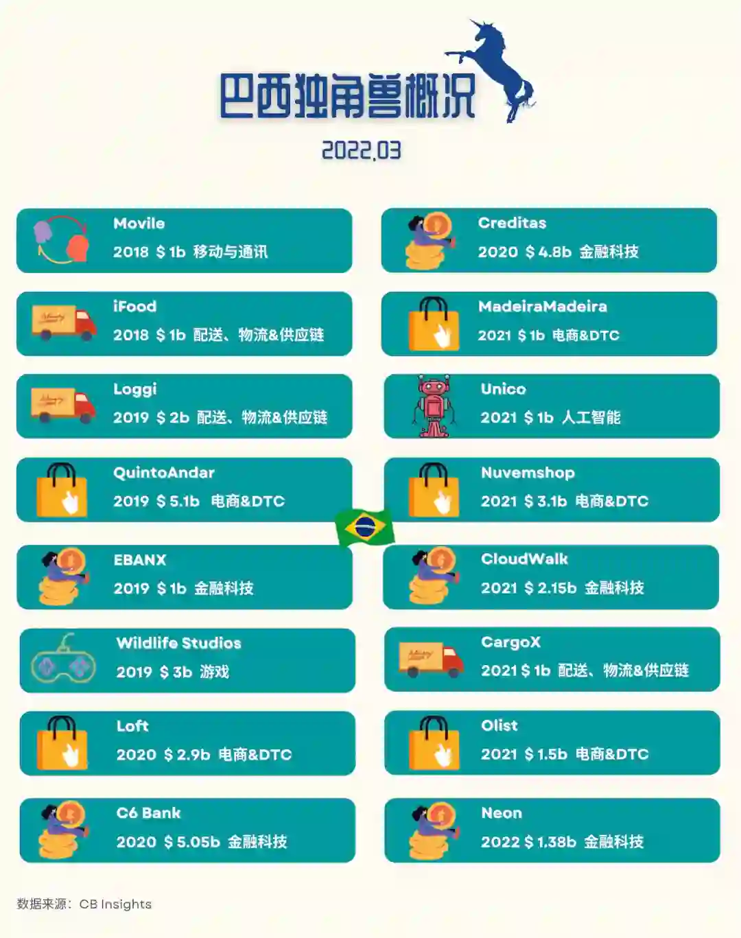 此外,根据 Distrito 的数据统计,巴西的金融科技企业在2021年获得的投资最多,达到37亿美元。零售初创公司紧随其后,获得了13亿美元的资金。此外,根据 CB Insights 统计,截至2022年3月,巴西共有16家独角兽。