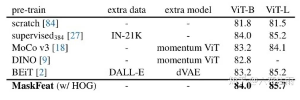 就这么简单,没有BEiT那种复杂的dVAE,MaskFeat 不仅在视频方面取得了不俗的性能,而且在图像方面也有不俗的性能,在ViT-B模型上性能超越BEiT、SimMIM、MAE等