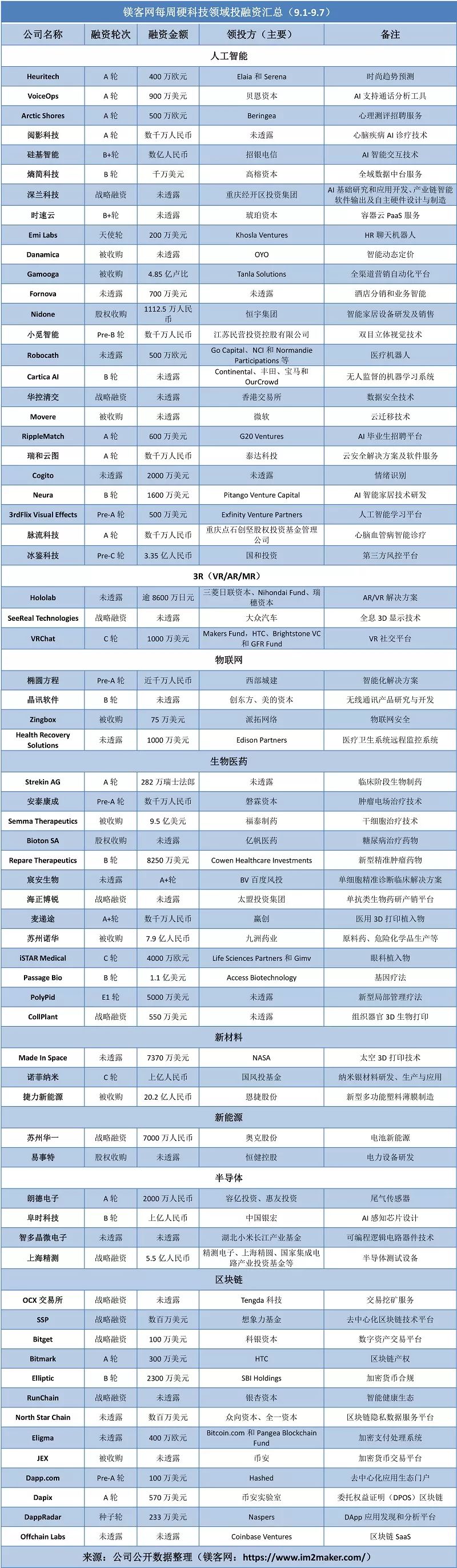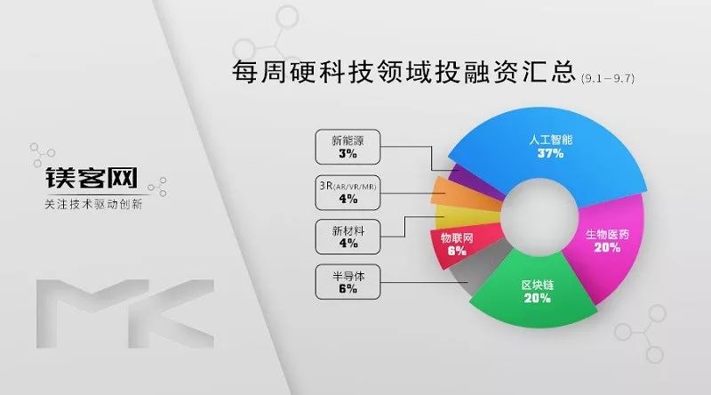 本周硬科技领域投融资事件一共67起,人工智能领域发生21起融资事件和4起收购事件,占比37%;生物医药领域发生10起融资事件和3起收购事件,区块链领域发生12起融资事件和1起收购事件,分别占比20%;物联网发生3起融资事件和1起收购事件,半导体领域发生4起融资事件,分别占比6%;3R(VR/AR/MR)领域发生3起融资事件,新材料领域发生2起融资事件和1起收购事件,分别占比4%;新能源领域发生1起融资事件和1起收购事件,占比3%。