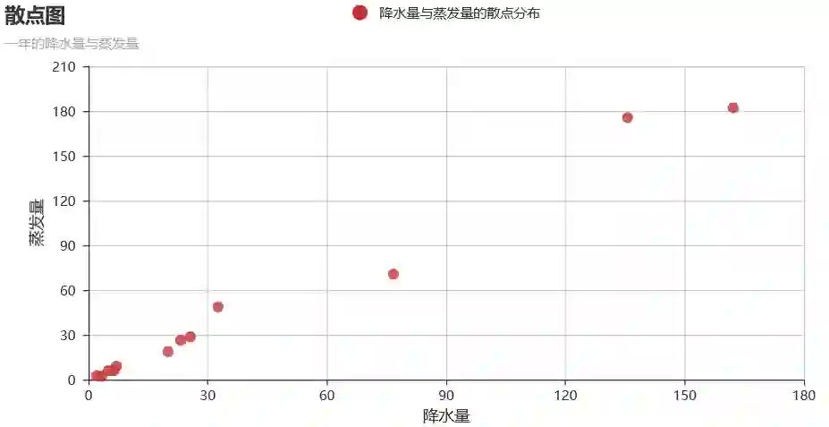 from pyecharts import Scatterscatter = Scatter("散点图", "一年的降水量与蒸发量")//xais_name是设置横坐标名称,这里由于显示问题,还需要将y轴名称与y轴的距离进行设置scatter.add("降水量与蒸发量的散点分布", data1,data2,xaxis_name="降水量",yaxis_name="蒸发量", yaxis_name_gap=40)scatter.render()