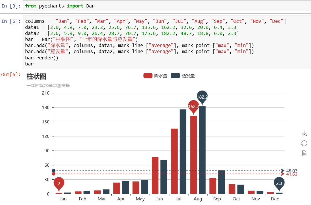 //导入柱状图-Barfrom pyecharts import Bar//设置行名columns = ["Jan", "Feb", "Mar", "Apr", "May", "Jun", "Jul", "Aug", "Sep", "Oct", "Nov", "Dec"]//设置数据data1 = [2.0, 4.9, 7.0, 23.2, 25.6, 76.7, 135.6, 162.2, 32.6, 20.0, 6.4, 3.3]data2 = [2.6, 5.9, 9.0, 26.4, 28.7, 70.7, 175.6, 182.2, 48.7, 18.8, 6.0, 2.3]//设置柱状图的主标题与副标题bar = Bar("柱状图", "一年的降水量与蒸发量")//添加柱状图的数据及配置项bar.add("降水量", columns, data1, mark_line=["average"], mark_point=["max", "min"])bar.add("蒸发量", columns, data2, mark_line=["average"], mark_point=["max", "min"])//生成本地文件(默认为.html文件)bar.render()