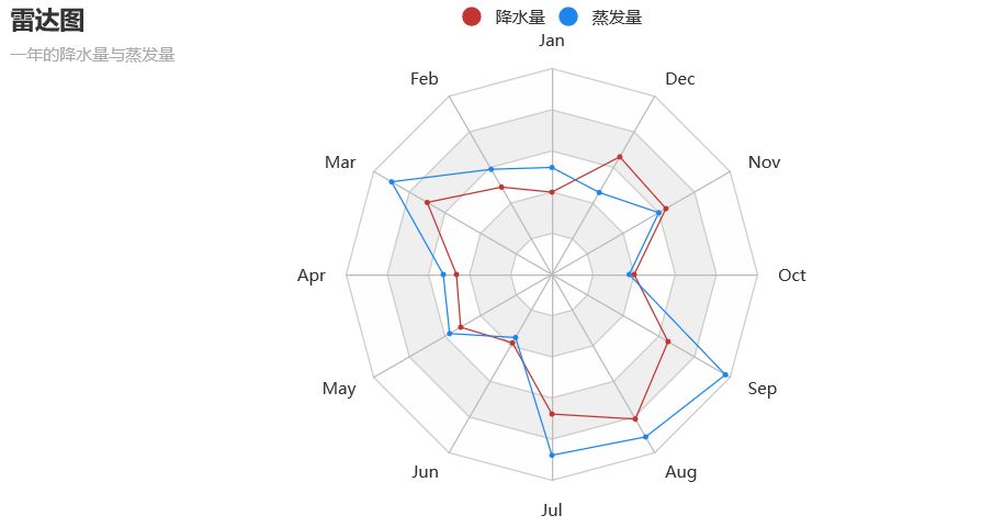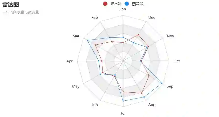 from pyecharts import Radarradar = Radar("雷达图", "一年的降水量与蒸发量")//由于雷达图传入的数据得为多维数据,所以这里需要做一下处理radar_data1 = [[2.0, 4.9, 7.0, 23.2, 25.6, 76.7, 135.6, 162.2, 32.6, 20.0, 6.4, 3.3]]radar_data2 = [[2.6, 5.9, 9.0, 26.4, 28.7, 70.7, 175.6, 182.2, 48.7, 18.8, 6.0, 2.3]]//设置column的最大值,为了雷达图更为直观,这里的月份最大值设置有所不同schema = [ ("Jan", 5), ("Feb",10), ("Mar", 10), ("Apr", 50), ("May", 50), ("Jun", 200), ("Jul", 200), ("Aug", 200), ("Sep", 50), ("Oct", 50), ("Nov", 10), ("Dec", 5)]//传入坐标radar.config(schema)radar.add("降水量",radar_data1)//一般默认为同一种颜色,这里为了便于区分,需要设置item的颜色radar.add("蒸发量",radar_data2,item_color="#1C86EE")radar.render()
