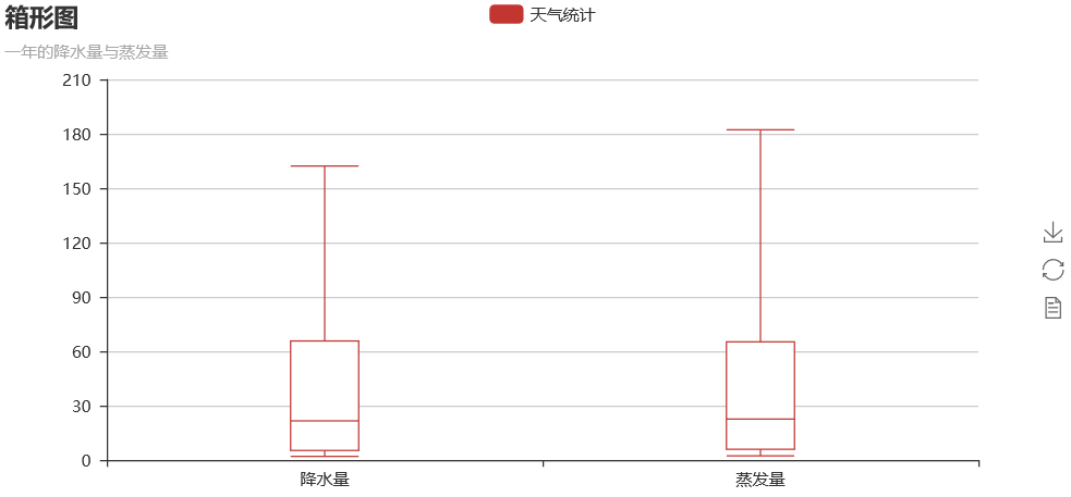 //导入箱型图Boxplotfrom pyecharts import Boxplot boxplot = Boxplot("箱形图", "一年的降水量与蒸发量")x_axis = [ 降水量 , 蒸发量 ]y_axis = [data1,data2]//prepare_data方法可以将数据转为嵌套的 [min, Q1, median (or Q2), Q3, max]yaxis = boxplot.prepare_data(y_axis) boxplot.add("天气统计", x_axis, _yaxis)boxplot.render()