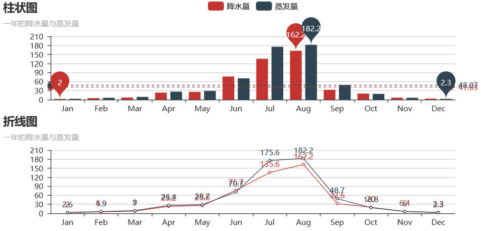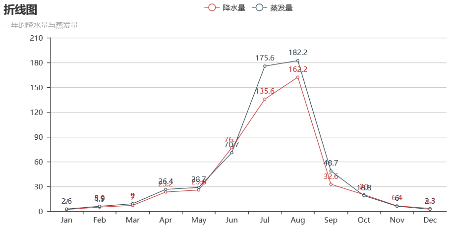 from pyecharts import Lineline = Line("折线图","一年的降水量与蒸发量")//is_label_show是设置上方数据是否显示line.add("降水量", columns, data1, is_label_show=True)line.add("蒸发量", columns, data2, is_label_show=True)line.render()