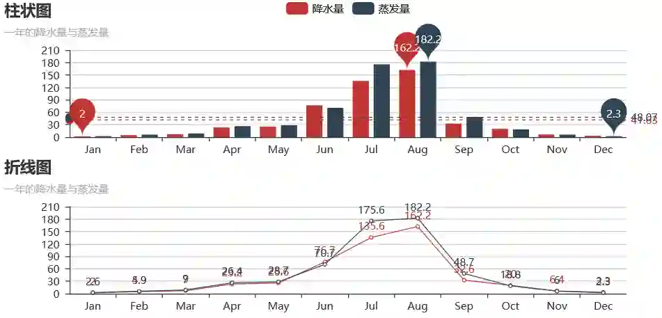 from pyecharts import Grid//设置折线图标题位置line = Line("折线图","一年的降水量与蒸发量",title_top="45%")line.add("降水量", columns, data1, is_label_show=True)line.add("蒸发量", columns, data2, is_label_show=True)grid = Grid()//设置两个图表的相对位置grid.add(bar, grid_bottom="60%")grid.add(line, grid_top="60%")grid.render()