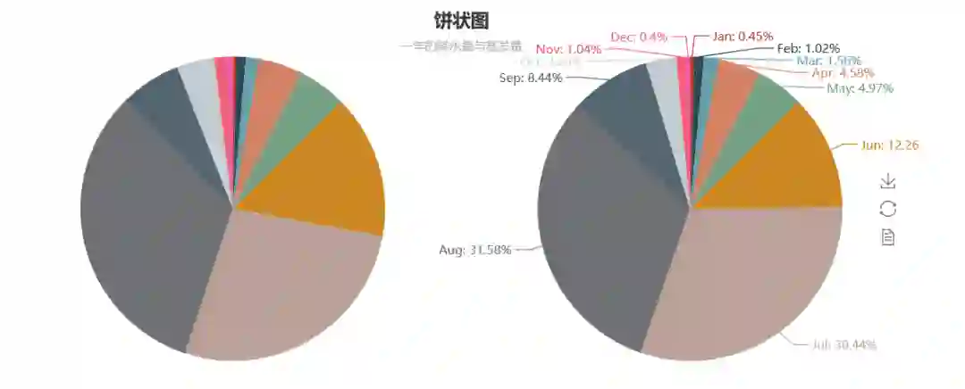 //导入饼图Piefrom pyecharts import Pie//设置主标题与副标题,标题设置居中,设置宽度为900pie = Pie("饼状图", "一年的降水量与蒸发量",title_pos= center ,width=900)//加入数据,设置坐标位置为【25,50】,上方的colums选项取消显示pie.add("降水量", columns, data1 ,center=[25,50],is_legend_show=False)//加入数据,设置坐标位置为【75,50】,上方的colums选项取消显示,显示label标签pie.add("蒸发量", columns, data2 ,center=[75,50],is_legend_show=False,is_label_show=True)//保存图表pie.render()