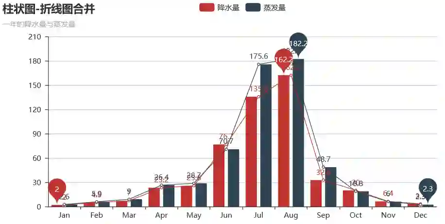 from pyecharts import Overlapoverlap = Overlap()bar = Bar("柱状图-折线图合并", "一年的降水量与蒸发量")bar.add("降水量", columns, data1, mark_point=["max", "min"])bar.add("蒸发量", columns, data2, mark_point=["max", "min"])overlap.add(bar)overlap.add(line)overlap.render()