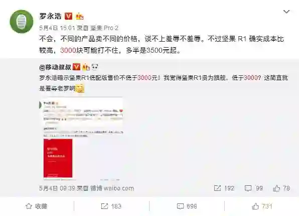 罗永浩自曝坚果R1低配版售价:不会低于3000
