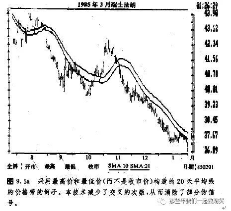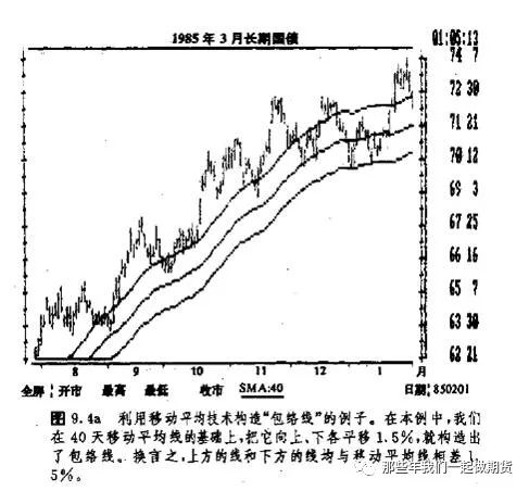 6.如果我们针对每日的最高价和最低价,分别采取与在收市价格下同样的移动平均方法,就得到了价格带(包容带)。它由两条移动平均线形成——一条是关于最高价的,一条是关于最低价的(见图9.5a