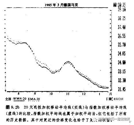 为了解决上述权重问题,有人提出了“线性加权移动平均值”的概念。在这种算法中,如果以10天平均值为例,那么,第10天的收市价要乘以10,第9天乘以9,第8天乘以8,依此类推。这样,越后来的收市价,权重越大。当然,下一步,我们要把其总和除以上述乘数的和(在本例中为55:10+9+8十…...+1=55)。无论如何,线性加权平均值法依然没有解决前一个间题,即它仍然仅仅包含平均值移动区间内的价格(见图9. 2a和b)。