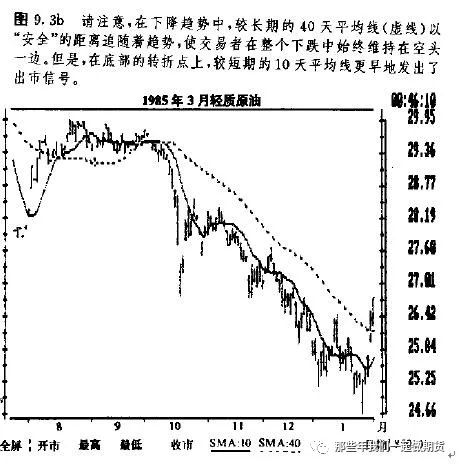 下面我们把上述比较再深入一步。当趋势持续时,较长期的平均线表现较佳。但是在趋势反转时,它的缺点就暴露无遗了。因为较长期平均线较为迟钝,它原本是从更远的距离外追踪趋势的,这样才使之在趋势过程中,不与短暂的调整搅在一起一。也正因其迟钝,当趋势反转时,它也不能及时反应出来。因此,我们给出另一个推论;只要趋势持续,那么较长期平均线就作用良好,但是当趋势处于反转过程中时,较短期的平均线更适用。