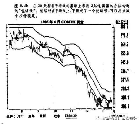 5.另一种流行的过滤器是“百分比包络线,,或者说“波幅带”。具体的做法是,在移动平均线的上方和下方的一定的百分比位置上,分别作出移动平均线的平移曲线。换言之,在移动平均线之上或之下,距离移·动平均线一定百分比的位置上,另画两条曲线。当收市价格不仅高过移动平均线自身,而且超越了上包络线之后,才构成买入信号。基本的移动平均线则变成了止损出市点(见图9. 4a和b)。