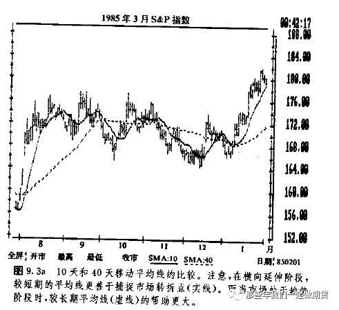 通常,当价格处于横向延伸的区间中时,短期移动平均线的效果较佳。因为在这类环境下,价格基本上无趋势可循,短期的较敏感的平均线能捕捉更多的短线价格波动(见图9. 3) 。