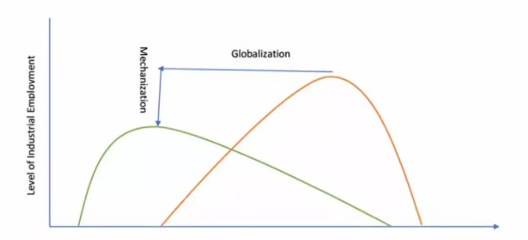 而发展中国家劳动力市场最大的担心,来自自动化对开放贸易的就业利益、投资等的冲击。换句话说,一些非洲和南亚国家无法再走中国和越南的路,朝着工业国家发展了。