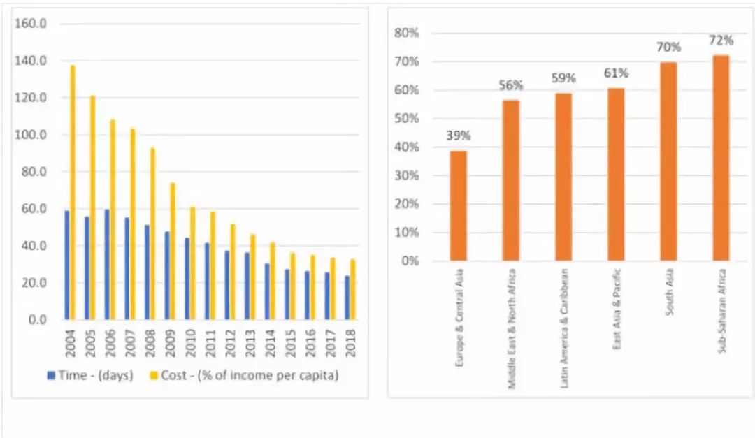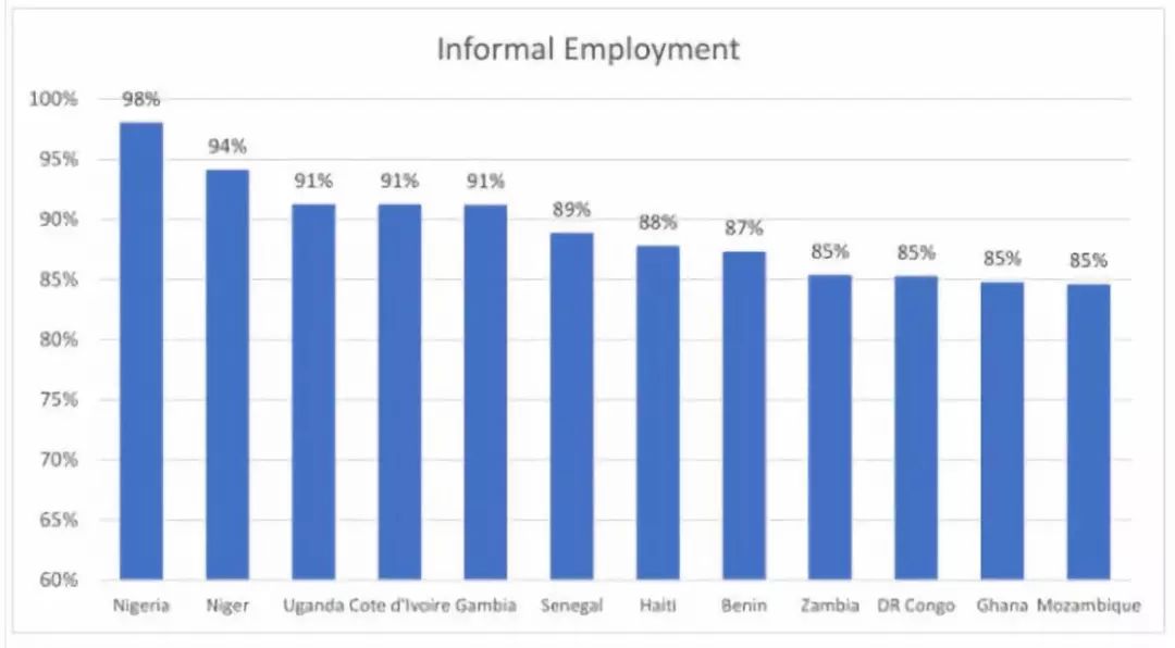 过去二十年,在发展中经济体中,非正式的情况没有大幅度减少。尽管商业环境在优化,但有些地区的非正式工作依然存在,部分发展中经济体的比例甚至达到了90%(赞比亚和马达加斯加等国家的非正式工作情况约占80%),新兴经济体的比例也有55%。
