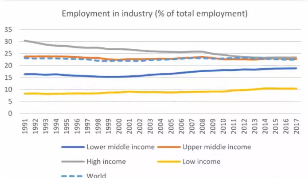 高收入国家,比如新加披、西班牙、葡萄牙,制造业就业率确实比1991年下跌了10%多,但相应的,服务业就业率在上升。低收入国家,则从1991年开始(到2017年),制造业在劳动力就业中的比重就一直在10%稳定,中上等收入国家这一比重维持在23%左右,中下等收入国家的这一比重(由于贸易开放和收入/需求增加)则经历了16.4%到18.8%的提升。