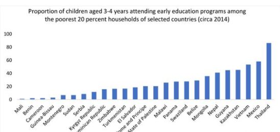 ▲在许多国家,来自弱势背景的儿童最不可能参加儿童早期教育计划