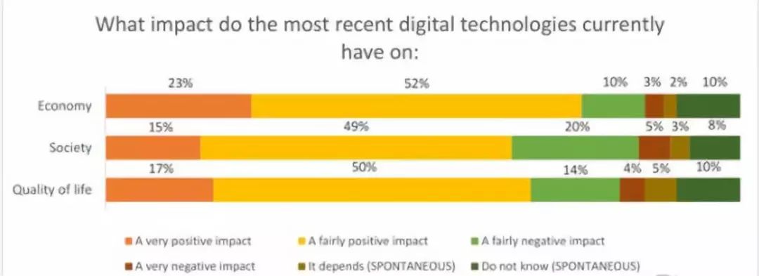 ▲欧盟调研《对数字化和自动化的影响的态度》(第一问:最近的数字科技在经济、社会和生活质量上的影响是积极的还是消极的?)