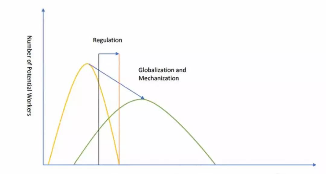 因此,在缺乏补贴政策的发达经济体,工人们被迫选择低工资或者暂时失业。与此同时,自动化侵蚀了廉价劳动力市场的吸引力,导致非洲或南亚的制造业就业没能被建立起来。