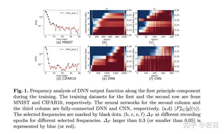 CIFAR-10、MNIST的神经网络的拟合过程,蓝色代表低频、红色代表高频,越到后面,接近于收敛的情况下,需要学习的低频分量越少。
